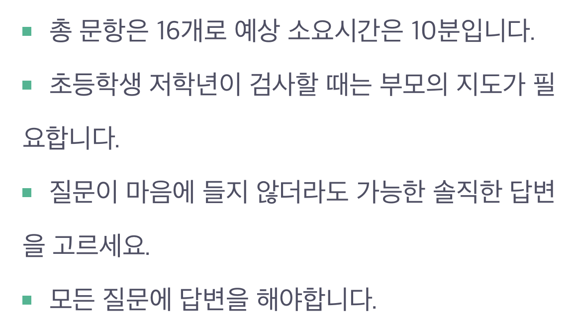 해당 검사는 초등학생 1학년부터 중학생 3학년까지 진행할 수 있는 검사로 테스트모아에서 직접 개발한 간소화된 버전이며 문항을 아이들이 이해하기 쉽도록 변형하였으며 총 문항 수가 14개로 쉽고 빠른 검사가 가능하고 초등학생 저학년이 검사할 때는 부모의 지도가 필요할 수 있다고 합니다.