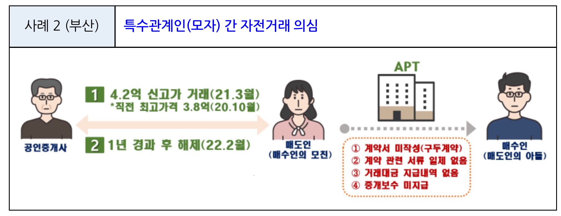 이 외에도 가족(모자) 간에 신고가로 매매계약을 체결하면서 전부 구두로 계약을 진행되어 계약금, 거래대금이 지급되지 않은 건으로 계약 및 계약 해제에 관련한 문자 등 어떠한 자료도 없으며 신고가 거래 후 1년이 지난 시점에 해제신고 된 점 등이 모자 간 특수관계인 자전거래로 의심되는 사례라고 합니다.