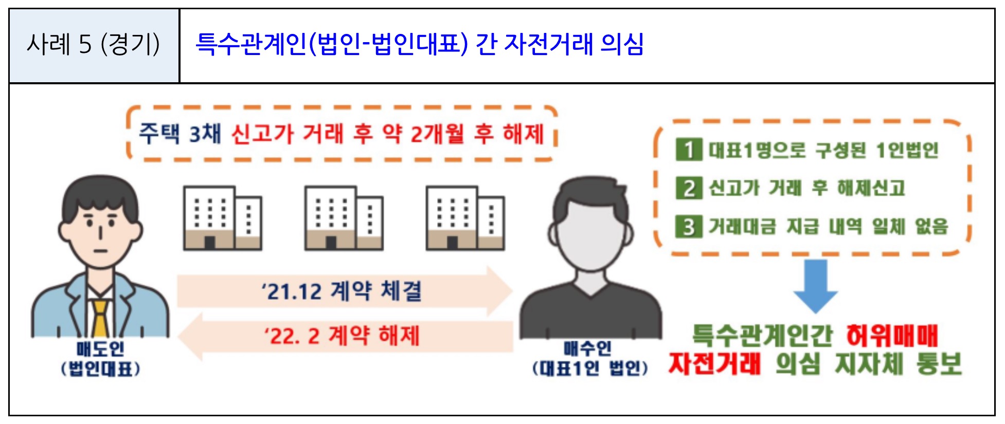 법인 대표가 본인 소유의 1인 법인에게 아파트 3채를 모두 신고가로 매도하였다가 약 2개월 후 3건 모두 계약 해제를 신고한 것으로 매매계약서의 진위 여부가 의심된 사례인데 조사 결과, 3건의 거래 모두 계약금 등 거래대금 지급 내역이 없었으며 그 중 1채는 해제신고 이후 다시 법인에게 더 높은 가격으로 매도한 것으로 가격 띄우기를 위한 자전거래로 의심되는 사례라고 합니다.