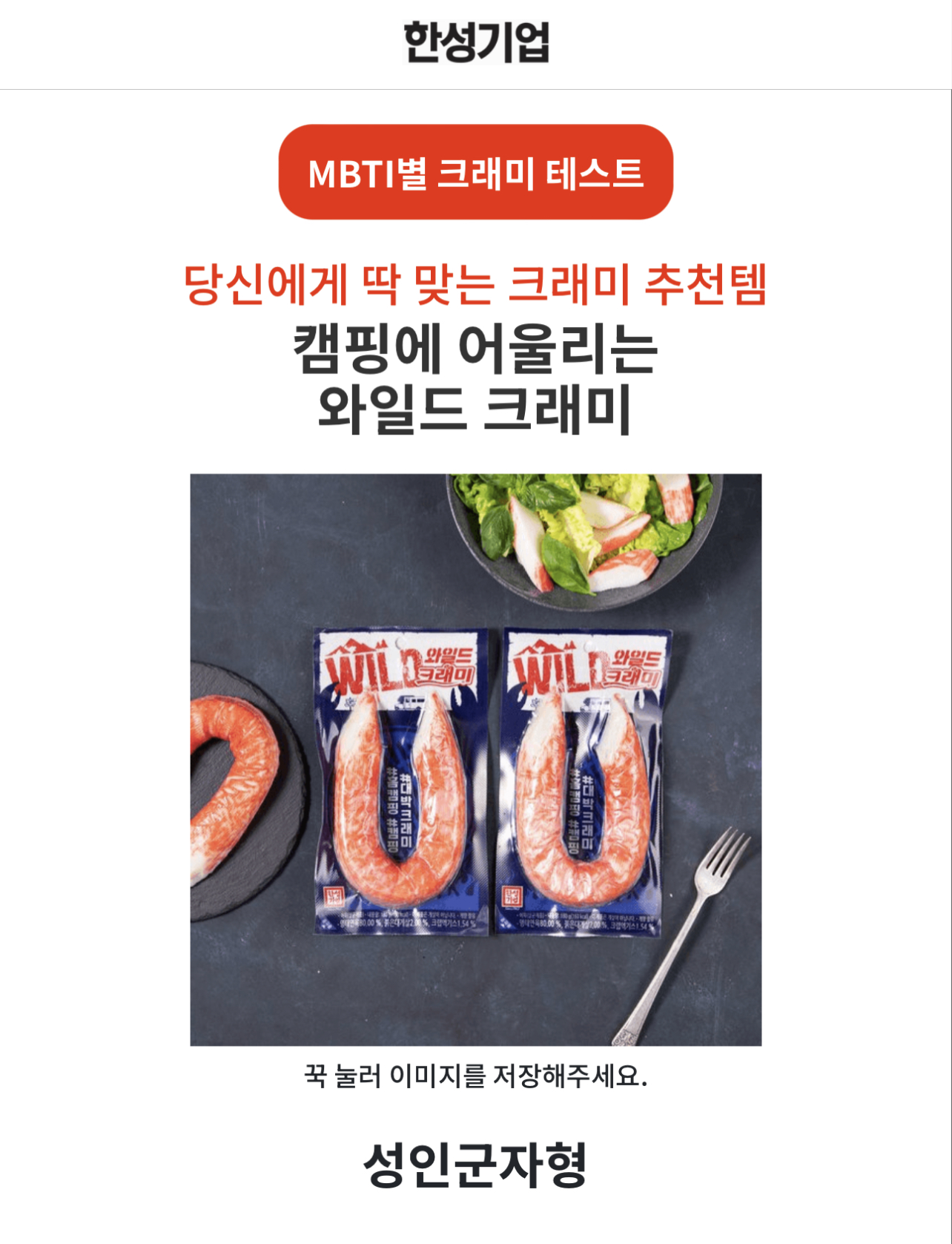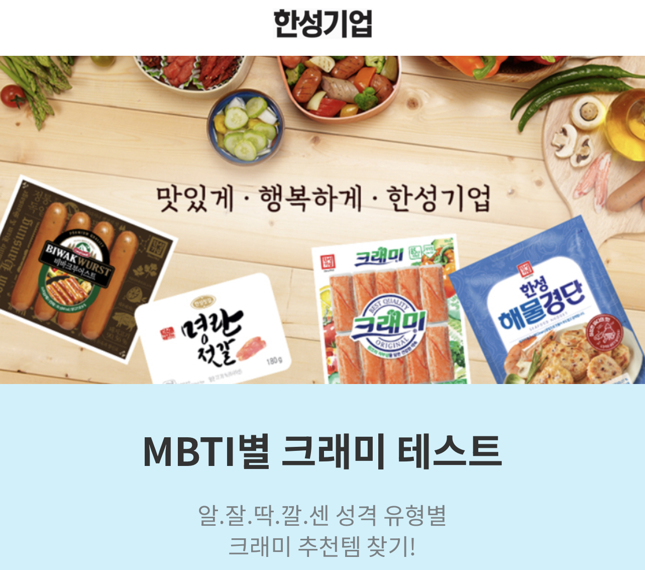 간식으로도 좋고 술안주로도 좋은 크래미는 저도 참 좋아하는데 한성기업에서 MBTI별 크래미 추천해주는 테스트가 있어서 소개드리려고 합니다.