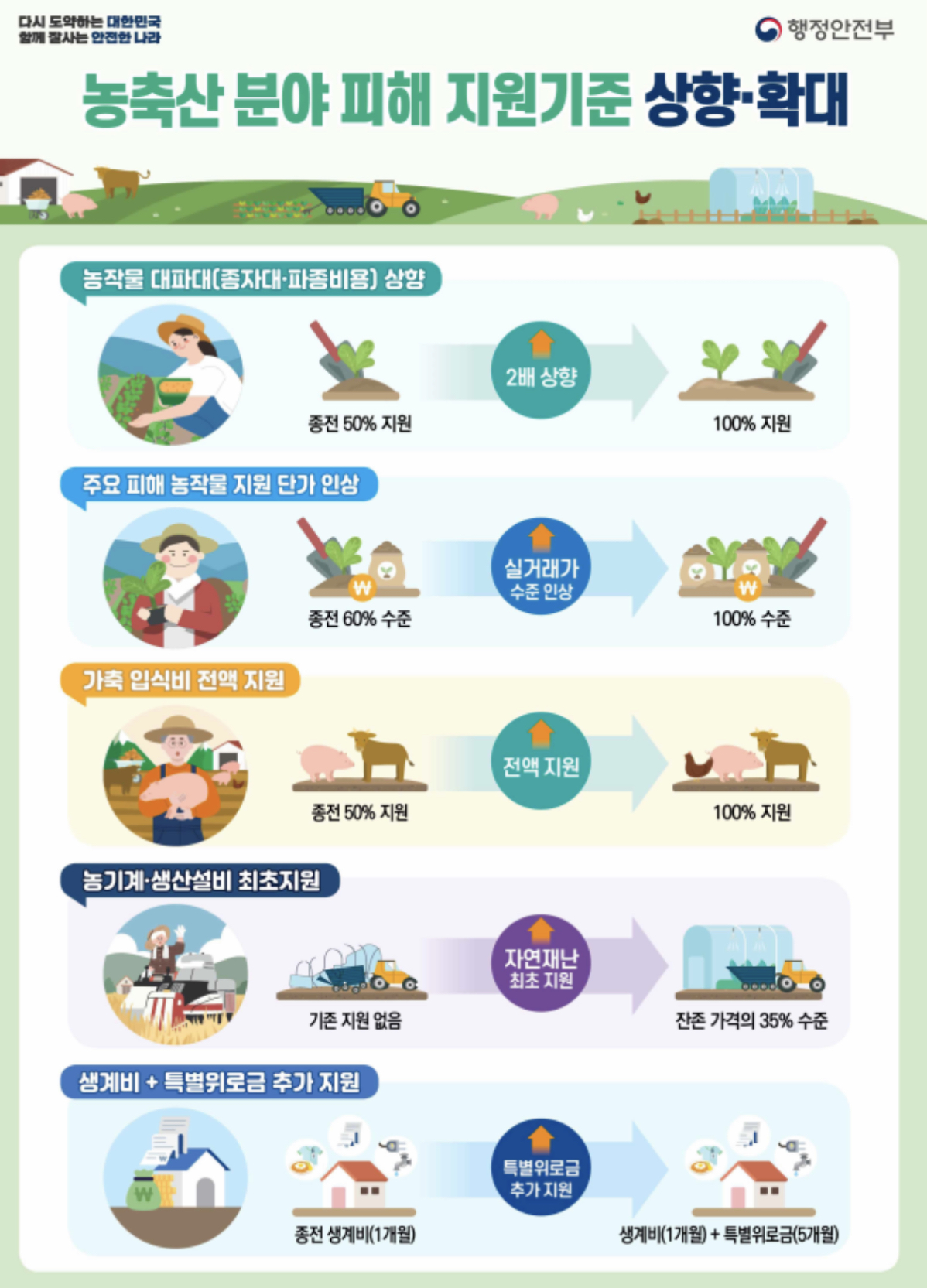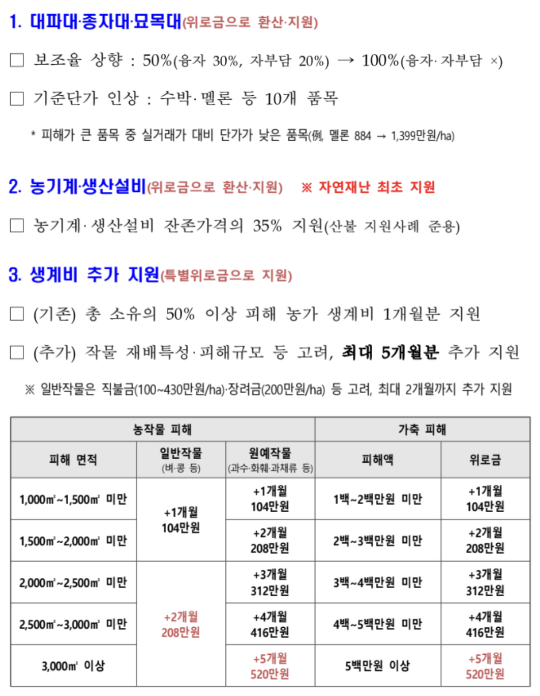 그러나, 이번 수해로 어려움을 겪고 있는 농·축산가의 현실을 반영하여 피해를 입은 분들이 조속히 생업에 복귀할 수 있도록 한시적으로 상향하기로 결정하였다고 합니다.