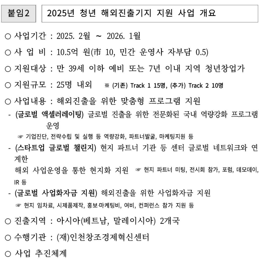 인천시는 2025년 4월 21일부터 5월 8일까지 해외 진출을 희망하는 청년 (예비)창업가 25명을 모집할 계획이라고 합니다.