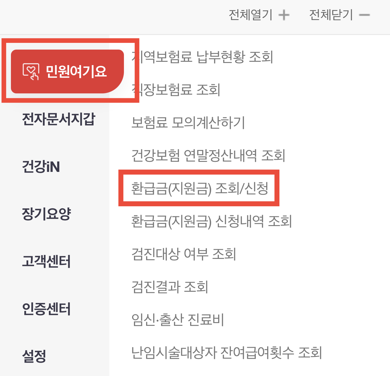 3. 민원여기요 클릭 후 환급금(지원금) 조회/신청 클릭하시면 됩니다.