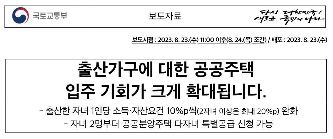 국토교통부(장관 원희룡)는「저출산・고령사회 정책과제 및 추진방향」(3.28.)의 후속조치로 출산가구에 대한 주거지원을 강화하는 내용을 담은 「공공주택 특별법 시행규칙」등 하위법령 개정안을 2023년 8월 28일(월)부터 입법예고(8.28~10.8, 잠정) 및 행정예고(8.28~9.19, 잠정) 한다고 밝혔습니다.
