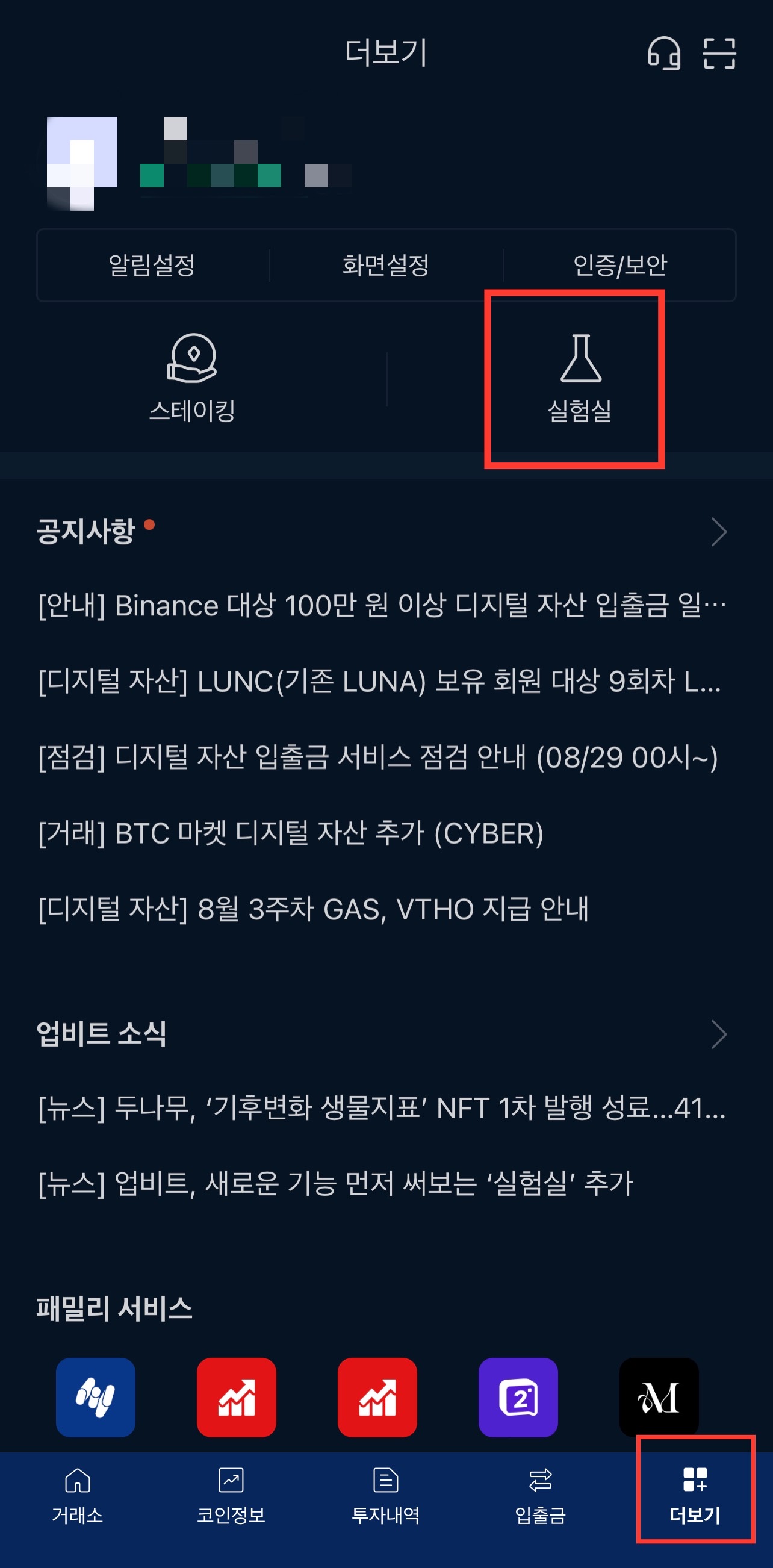 3. 하단에 더보기 클릭 후 실험실을 눌러주세요