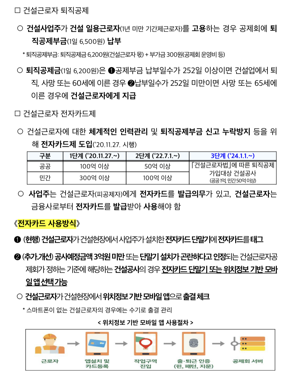 건설근로자 전자카드제는 퇴직공제부금 신고 누락방지 등을 위해 ’20년 11월부터 시행되어 대규모 건설현장부터 단계별로 확대 적용(현재 공공 50억원, 민간 100억원 이상)되었으며 ’24.1.1.부터는 모든 퇴직공제 가입 대상 건설공사(공공 1억원, 민간 50억원 이상)에 전면 시행된다고 밝혔습니다.