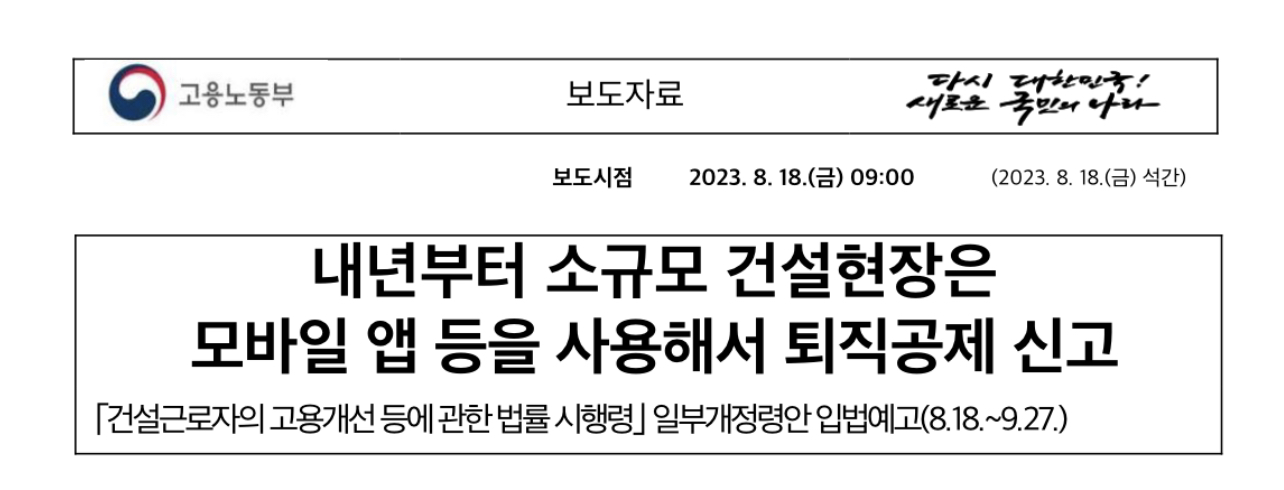 고용노동부는 소규모 건설현장 등에서는 건설근로자 퇴직공제 신고를 위해 전자카드 단말기(이하 ‘단말기’) 대신 위치정보에 기반한 모바일 애플리케이션(이하 ‘모바일 앱’)을 활용해 전자카드를 사용할 수 있게 하는 내용의 「건설근로자의 고용개선 등에 관한 법률 시행령」 개정안을 2023년 8월 18일부터 입법예고했습니다.