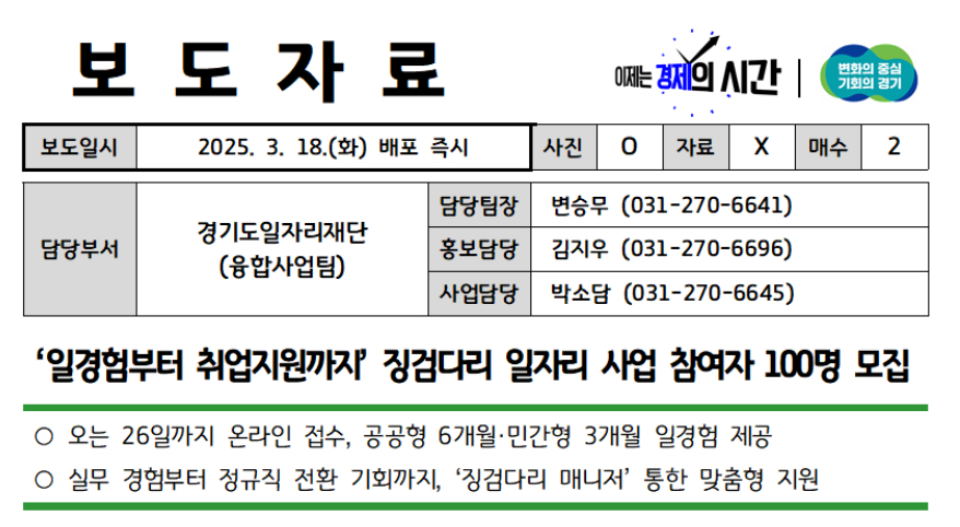 경기도 징검다리 일자리 사업 모집 기한은 2025년 3월 26일 수요일 오후 5시까지이며, 100명을 모집한다고 합니다.