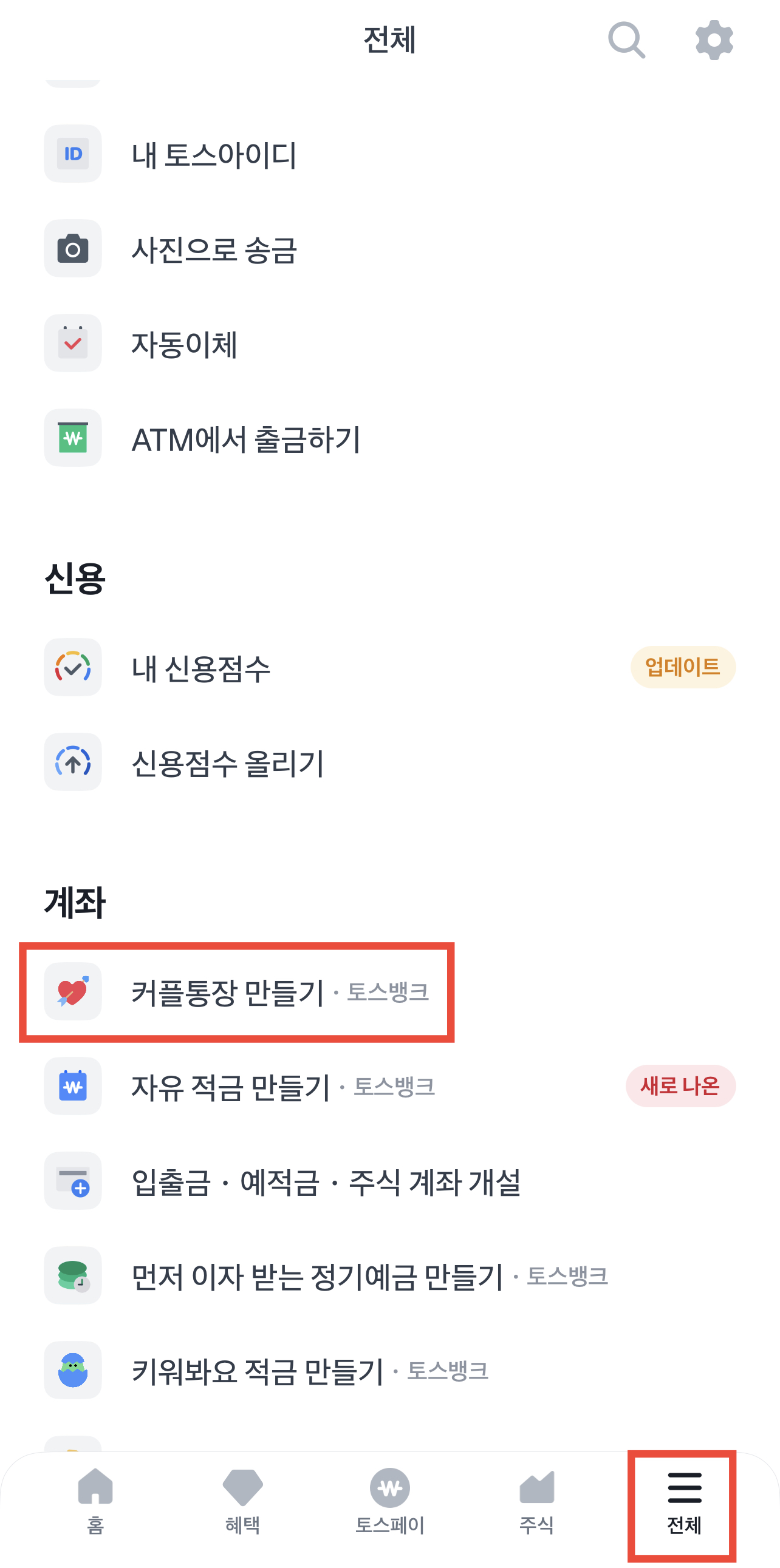 2. 하단에 전체 클릭 후 커플통장 만들기 클릭