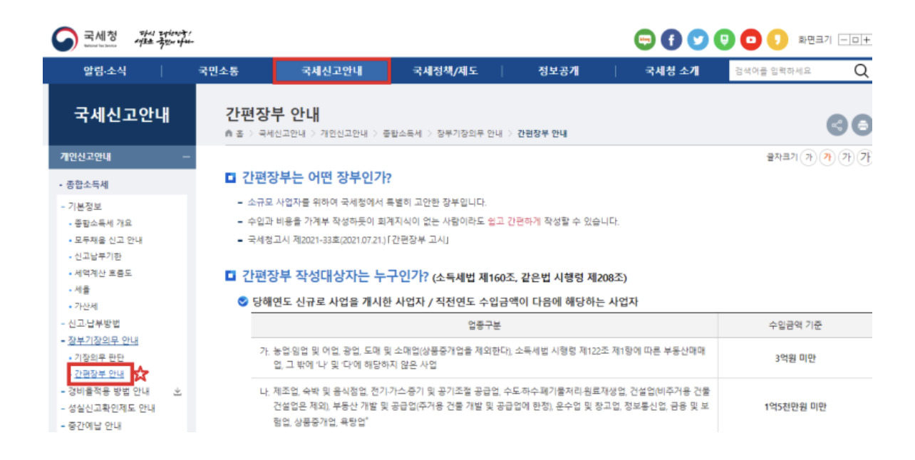 국세청 누리집 → 국세신고안내 종합소득세 → 간편장부 안내