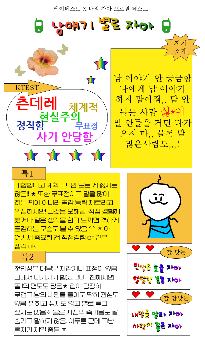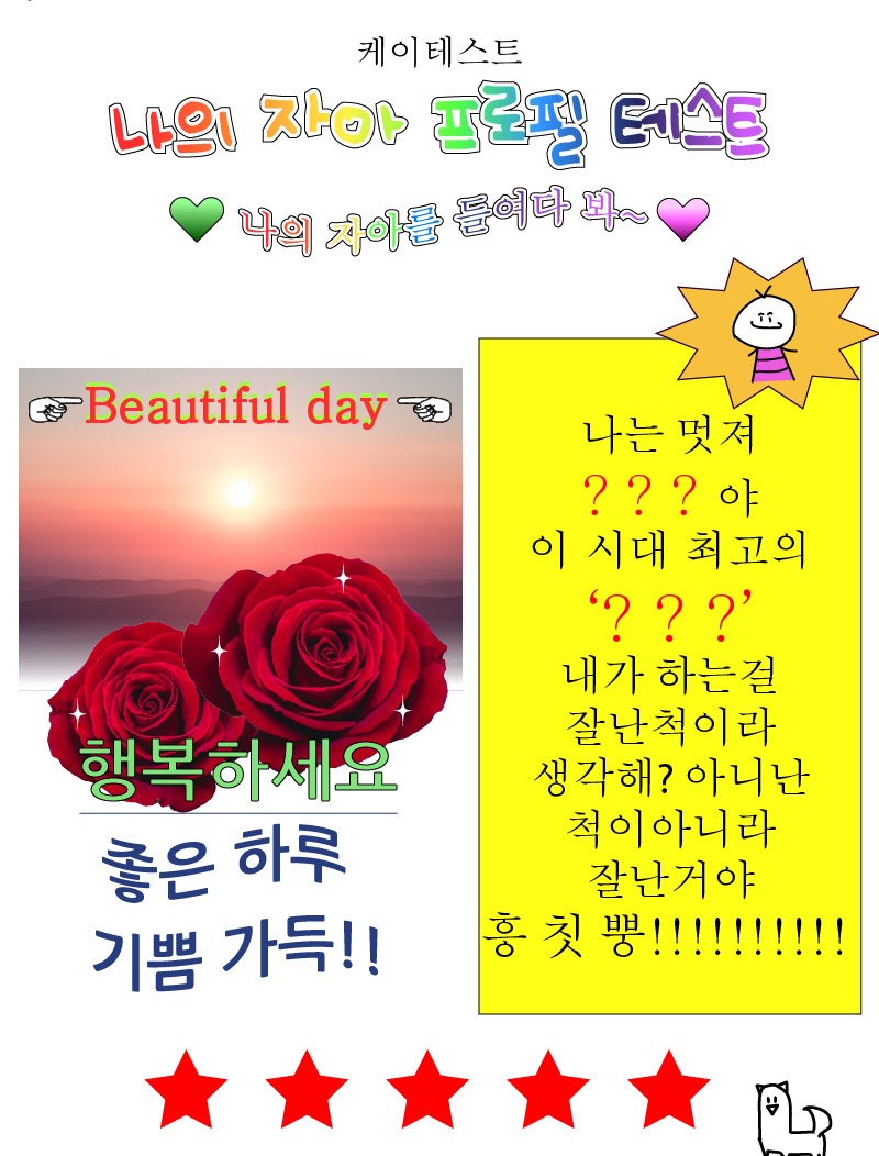 케이테스트라는 다양한 재밌는 테스트를 만들어 제공하는 사이트에서 나의 자아를 들여다 볼 수 있는 재밌는 테스트가 나왔는데 여러분들께 소개드리려고 합니다.