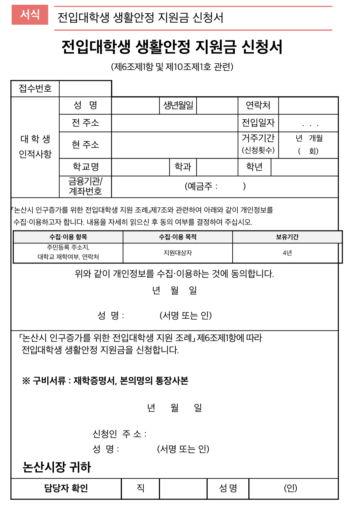 논산시 전입 대학생 생활안정지원금 지급 신청