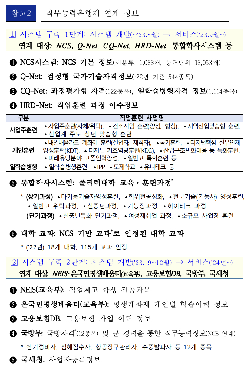 * (자격) 검정형 국가기술자격(544종목), 과정평가형 자격(122 종목), 일학습병행자격(1,114 종목)(훈련) 내일배움카드 훈련(일반직종, 국가기간전략산업훈련, KDT 등), 사업주훈련, 컨소시엄 훈련 등(교육) 폴리텍 교육·훈련과정, NCS 기반 교과로 인정된 대학 교과 등