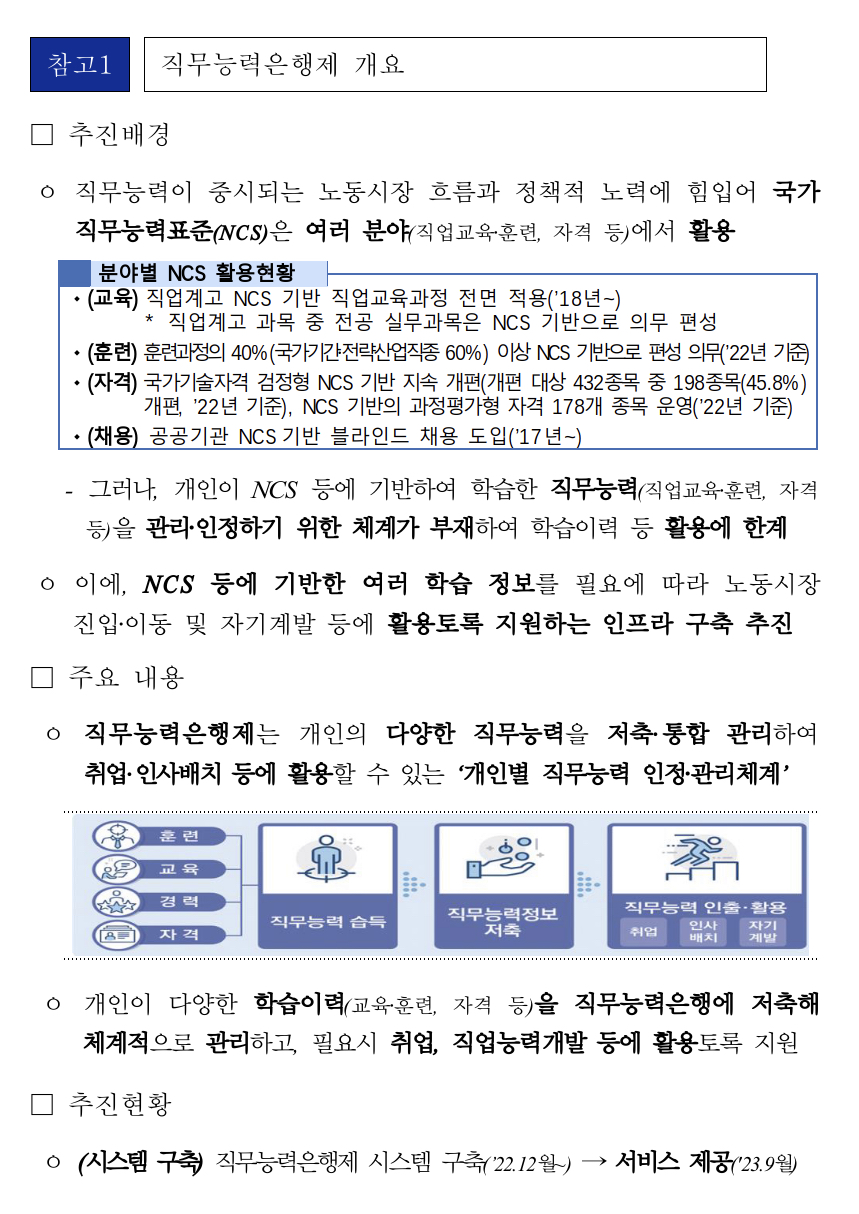 고용노동부(장관 이정식)와 한국산업인력공단(이사장직무대행 김영중)은 전 국민의 생애경력관리와 취업 지원을 위해 ’23.9.1.(금)부터 직무능력은행 서비스를 시행한다고 밝혔습니다.