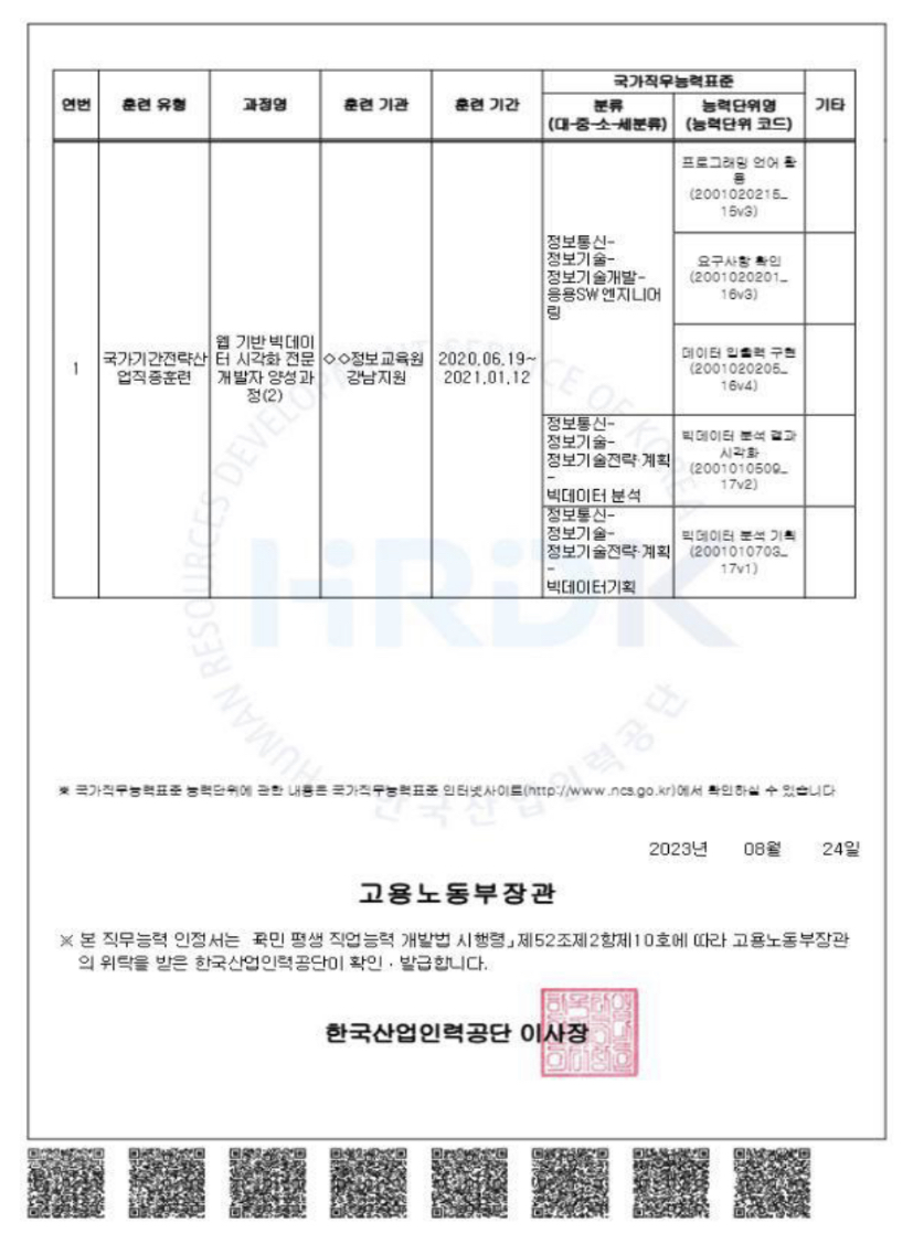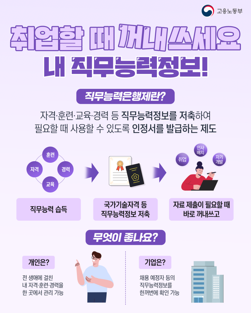 또한, 기업은 직무능력인정서를 통해 구직자나 재직자의 구체적인 직무능력정보를 확인할 수 있어 직무능력 중심 채용·인사 배치 등에 활용할 수 있게 됩니다.