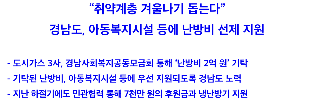 이번 난방비 지원은 지난 3월 도내 도시가스 3개사*가 경상남도 사회복지공동모금회(회장 강기철)로 기탁한 2억 원을 재원으로 한다고 합니다.