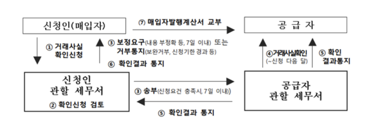 공급자 관할 세무서에는 신청 다음 달 말일까지 거래 사실을 확인하여 실제 거래임이 판명되면 매입자와 공급자 관할 세무서에 거래 사실 확인 결과를 통지합니다.