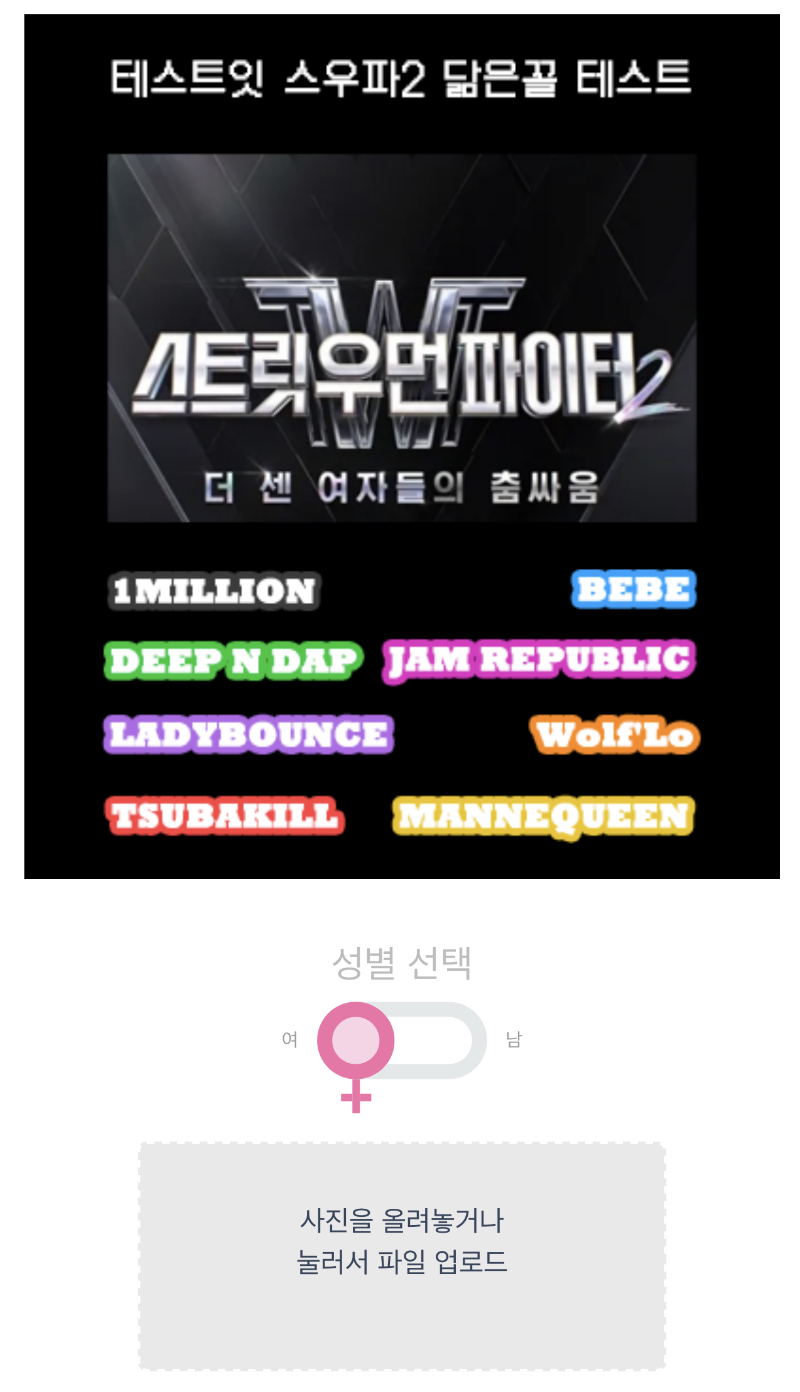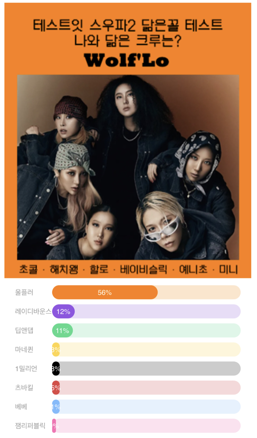 스우파2 참가 크루는 1MILLION, BEBE, DEEP N DAP, JAM REPUBLIC, LADYBOUNCE, MANNEQUEEN, TSUBAKILL, Wolf'Lo가 참여하는데 과연 나는 이 중에서 누가 닮았는지 알아보는 테스트가 있습니다.