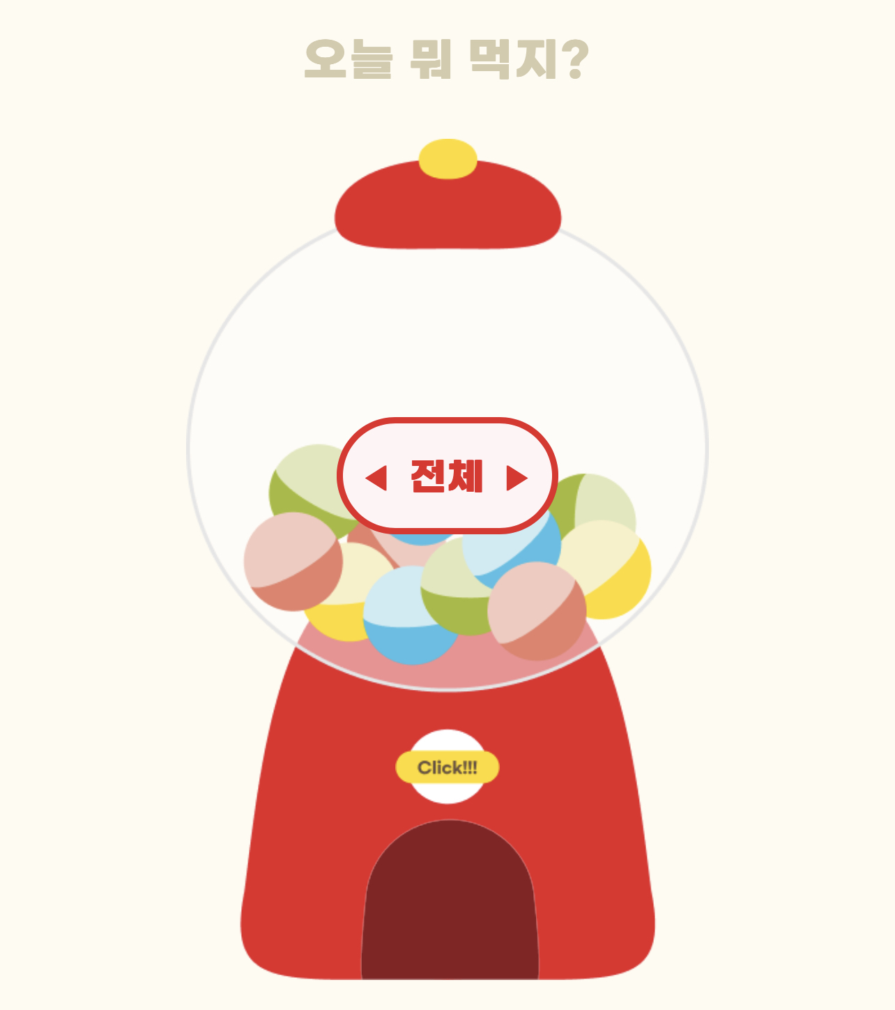 위 사진에 보시다시피 음식 추천 캡슐처럼 나오는데 전체, 한식, 양식, 중식, 일식, 간식을 선택해서 캡슐을 돌릴 수 있습니다.