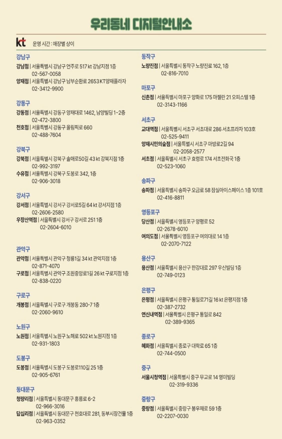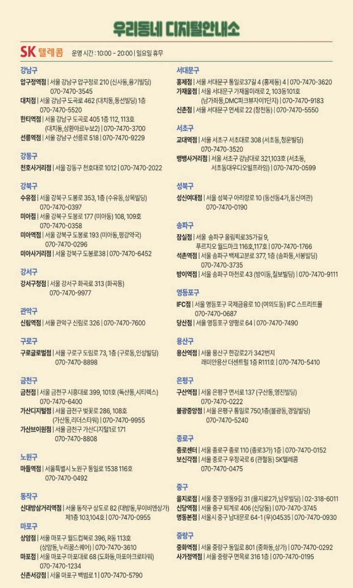 서울시(종로구, 중구, 용산구, 성동구, 광진구, 동대문구, 중랑구, 성북구, 강북구, 도봉구, 노원구, 은평구, 서대문구, 마포구, 양천구, 강서구, 구로구, 금천구, 영등포구, 동작구, 관악구, 서초구, 강남구, 송파구, 강동구) 우리동네 디지털안내소를 잘 확인하시고 가시길 바랍니다.