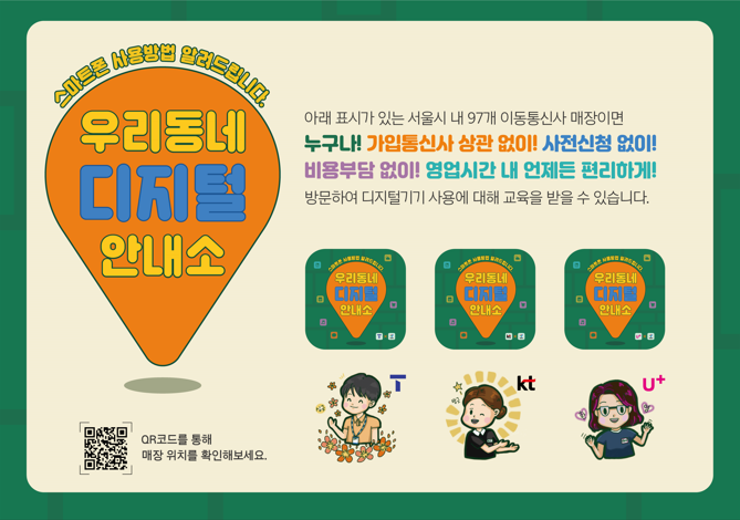 통신사가 보유한 디지털 전문인력과 어디서나 쉽게 찾을 수 있는 매장 접근성을 활용하여 디지털 기기 교육 서비스를 제공하는 ‘우리동네 디지털안내소’는 지난해부터 시민의 디지털 역량을 높이기 위해 다각적으로 노력 중인 서울시의 정책에 공감한 이동통신 3사의 적극적인 의지와 참여로 운영하게 됐다고 합니다.