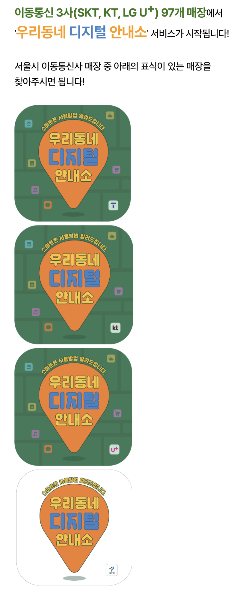 참고로 서울시와 이동통신 3사는 우선 직영점 위주의 97개 매장에서 ‘우리동네 디지털안내소’를 시범 운영한 후 수요와 효과를 모니터링하여 점진적으로 서비스 매장을 확대해 나갈 예정이라고 합니다.