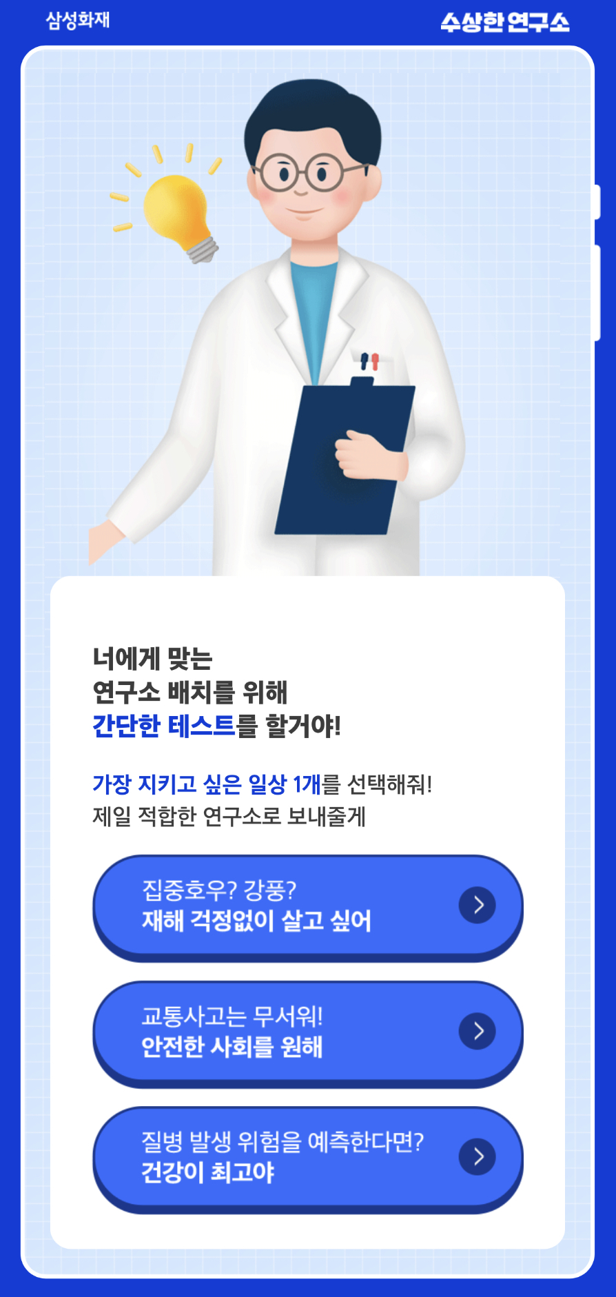 삼성화재에서 수상한 연구소 직무적성검사라고 “나는 어느 연구소가 어울릴까?”알아보는 재미난 테스트가 있다고 해서 소개드리려고 합니다.