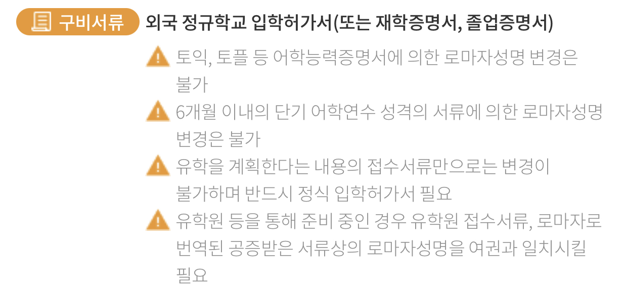 ▶6개월 이내의 단기 어학연수 성격의 서류에 의한 로마자성명 변경은 불가