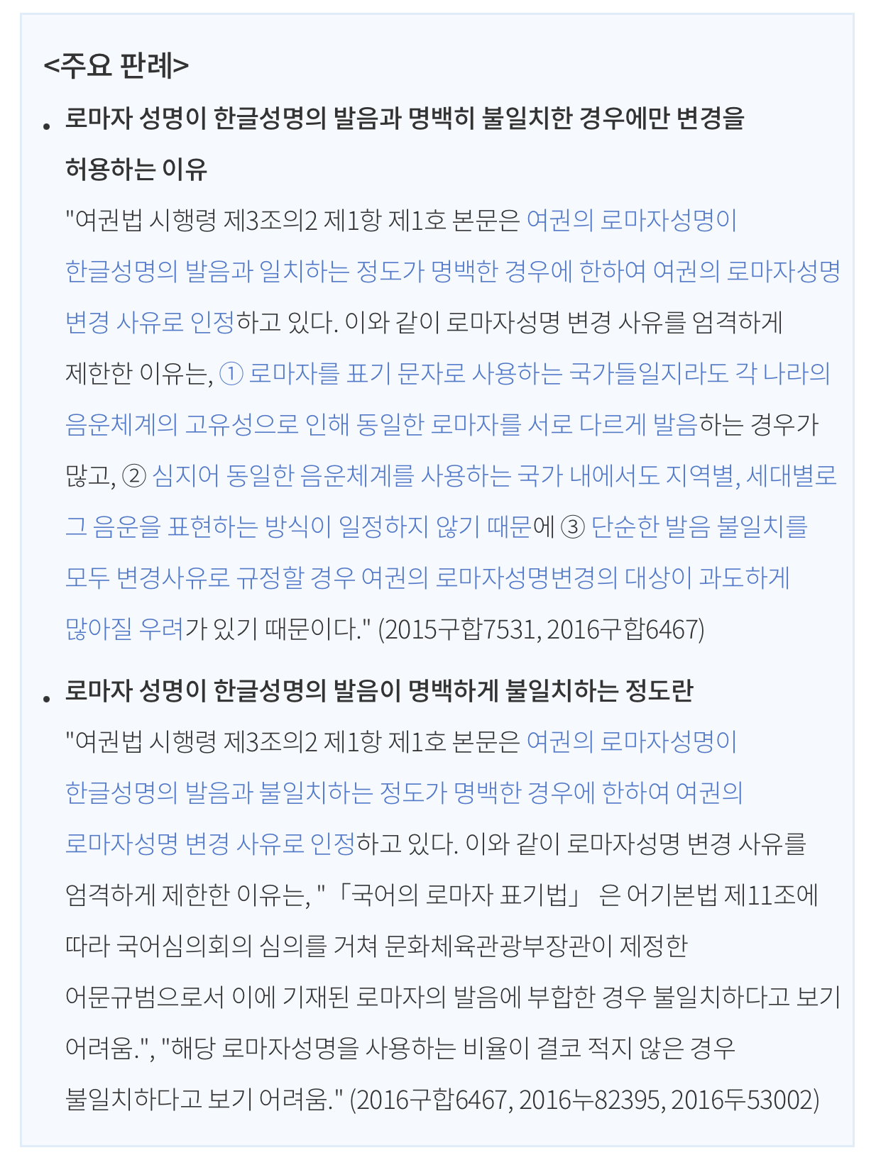 "여권법 시행령 제3조의 2 제1항 제1호 본문은 여권의 로마자성명이 한글성명의 발음과 일치하는 정도가 명백한 경우에 한하여 여권의 로마자성명 변경 사유로 인정하고 있다. 이와 같이 로마자성명 변경 사유를 엄격하게 제한한 이유는, ① 로마자를 표기 문자로 사용하는 국가들일지라도 각 나라의 음운체계의 고유성으로 인해 동일한 로마자를 서로 다르게 발음하는 경우가 많고, ② 심지어 동일한 음운체계를 사용하는 국가 내에서도 지역별, 세대별로 그 음운을 표현하는 방식이 일정하지 않기 때문에 ③ 단순한 발음 불일치를 모두 변경사유로 규정할 경우 여권의 로마자성명변경의 대상이 과도하게 많아질 우려가 있기 때문이다." (2015구합7531, 2016구합6467)