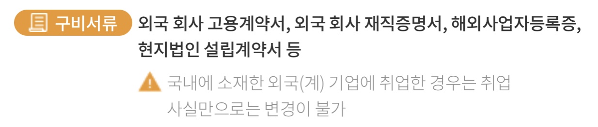 외국 회사 고용계약서, 외국 회사 재직증명서, 해외사업자등록증, 현지법인 설립계약서 등