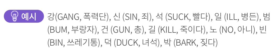강(GANG, 폭력단), 신 (SIN, 죄), 석 (SUCK, 빨다), 일 (ILL, 병든), 범 (BUM, 부랑자), 건 (GUN, 총), 길 (KILL, 죽이다), 노 (NO, 아니), 빈 (BIN, 쓰레기통), 덕 (DUCK, 녀석), 박 (BARK, 짖다)