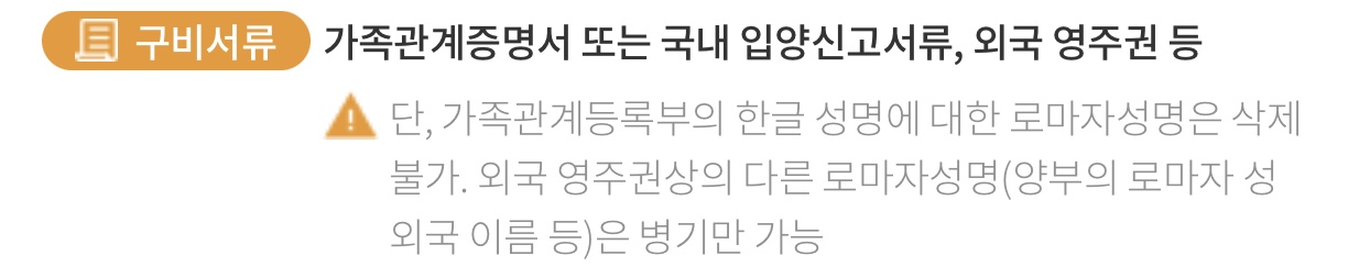 ▶단, 가족관계등록부의 한글 성명에 대한 로마자성명은 삭제 불가. 외국 영주권상의 다른 로마자성명(양부의 로마자 성 외국 이름 등)은 병기만 가능