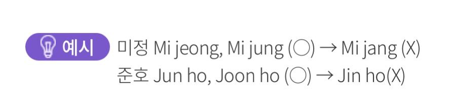 미정 Mi jeong, Mi jung (○) → Mi jang (X)