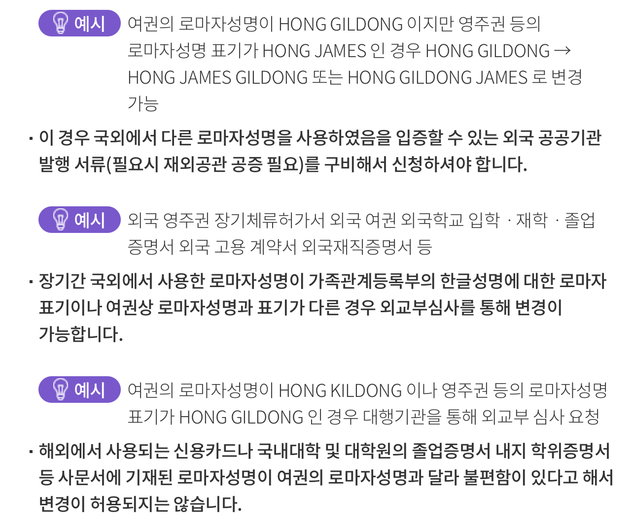 • 또한 발음이 명백하게 일치하지 않는 경우라도 통계 상 해당 한글성명을 가지고 있는 사람 중 외교부장관이 정하여 고시하는 기준(1% 또는 1만 명) 이상에 해당하는 사람이 사용하고 있는 로마자성명인 경우에는 변경이 불가합니다.
