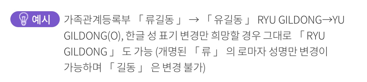 가족관계등록부 「 류길동 」 → 「 유길동 」 RYU GILDONG→YU GILDONG(O), 한글 성 표기 변경만 희망할 경우 그대로 「 RYU GILDONG 」 도 가능 (개명된 「 류 」 의 로마자 성명만 변경이 가능하며 「 길동 」 은 변경 불가)