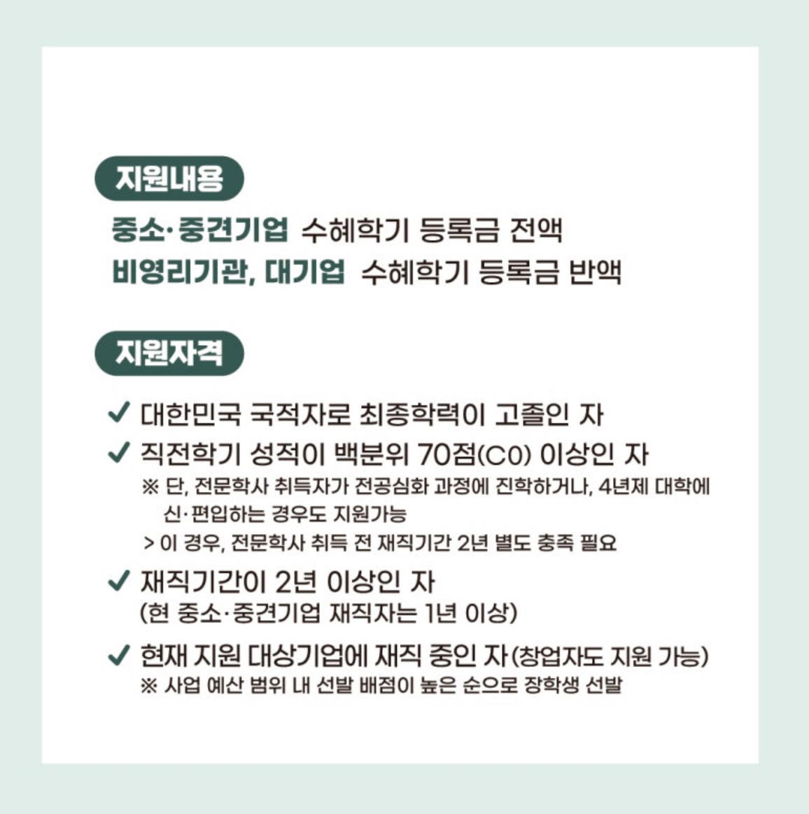 중소•중견기업 수혜학기 등록금 전액 비영리기관, 대기업 수혜학기 등록금 반액