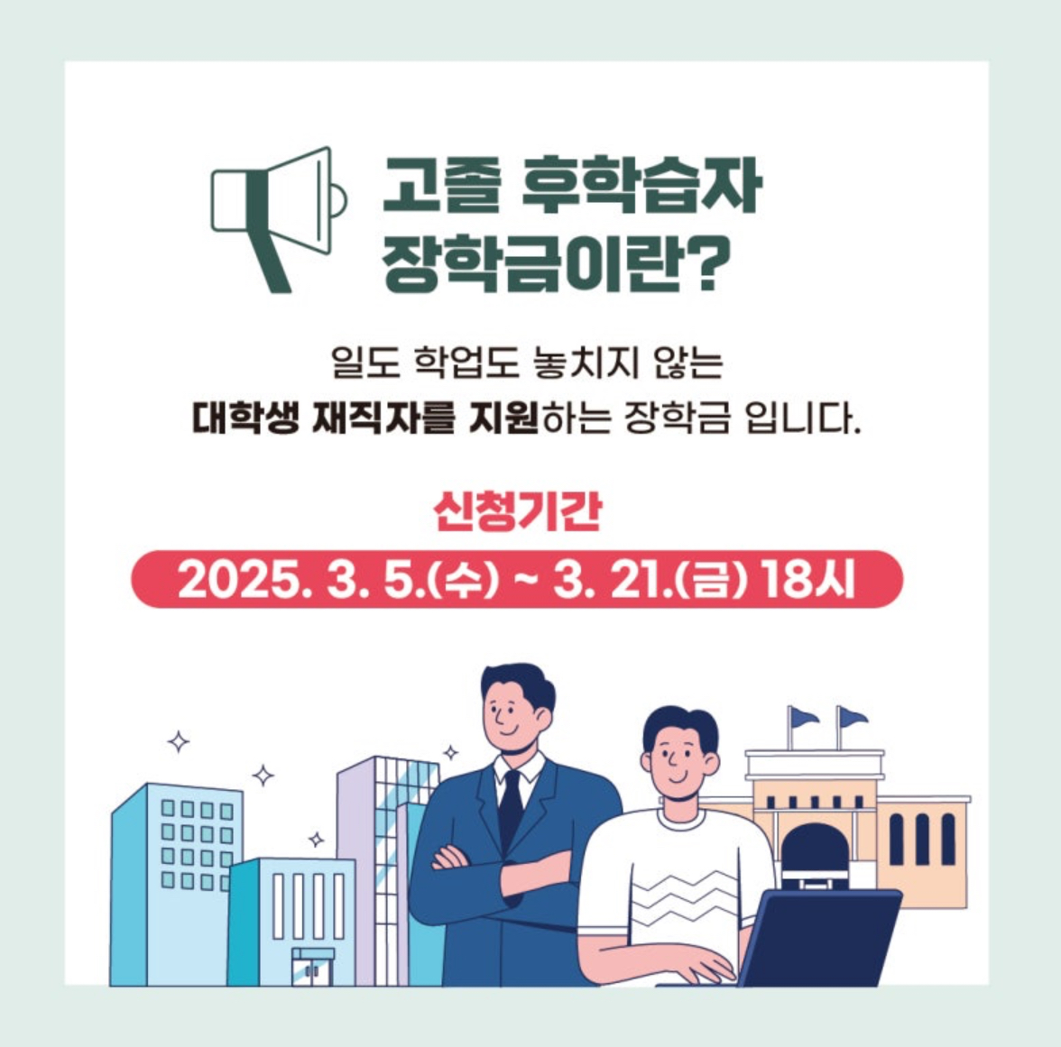 고졸 후학습자 장학금이란 일도 학업도 놓치지 않는 대학생 재직자를 지원하는 장학금입니다.