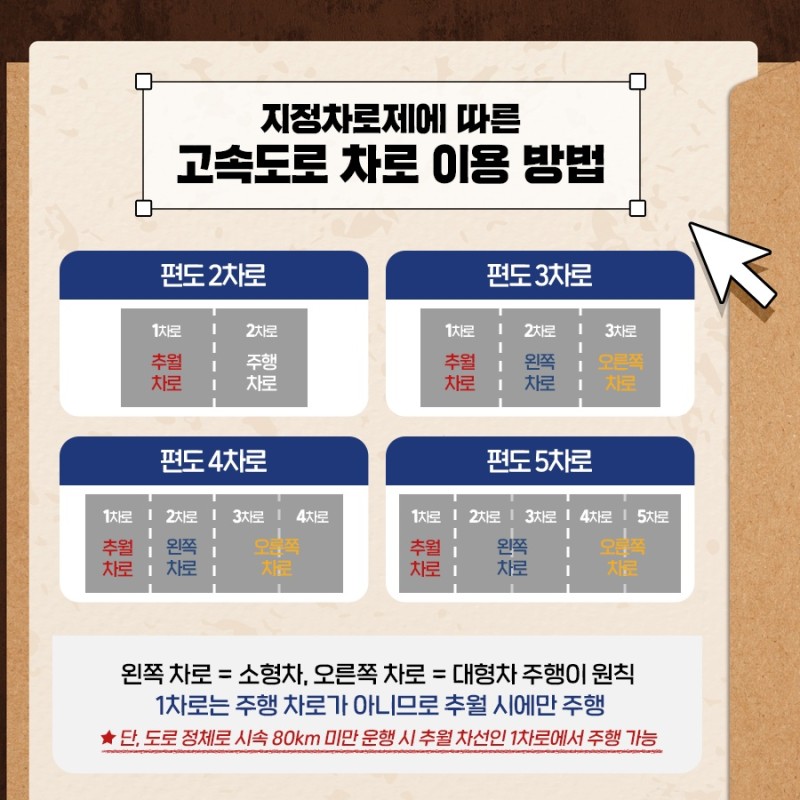 *단, 도로 정체로 시속 80km 미만 운행 시 추월 차선인 1차로에서 주행 가능