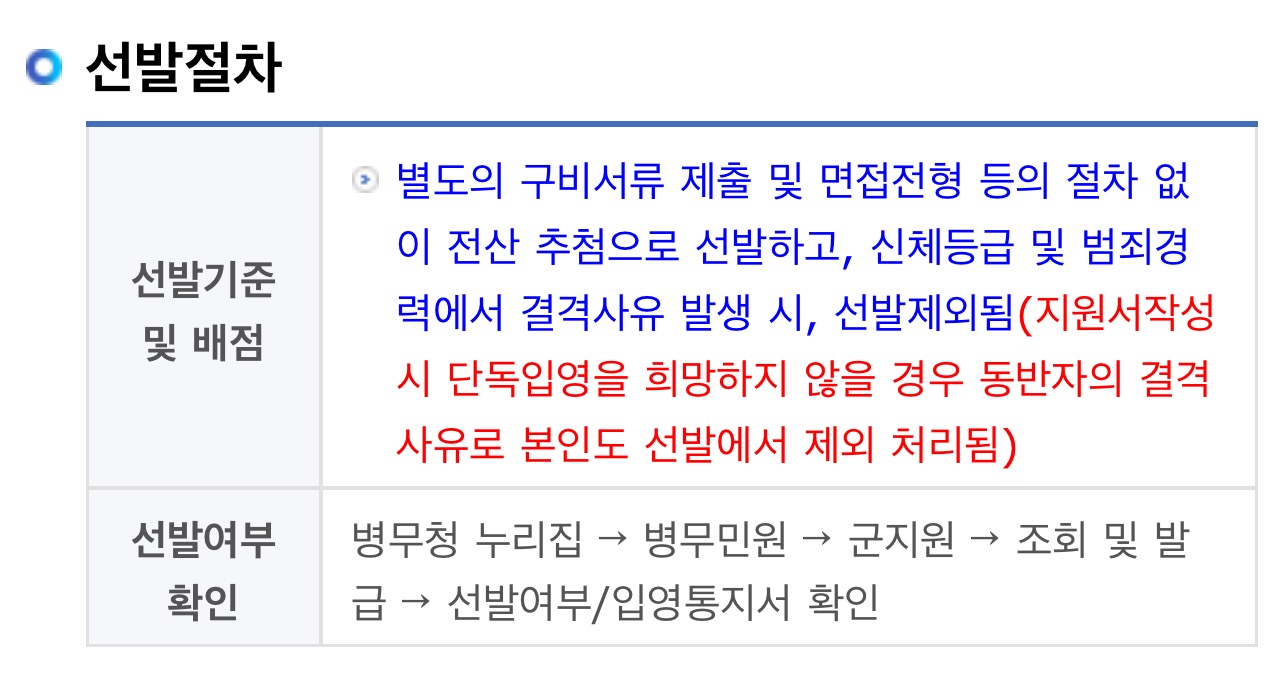 별도의 구비서류 제출 및 면접전형 등의 절차 없이 전산 추첨으로 선발하고, 신체등급 및 범죄경력에서 결격사유 발생 시, 선발제외됨(지원서작성 시 단독입영을 희망하지 않을 경우 동반자의 결격사유로 본인도 선발에서 제외 처리됨)