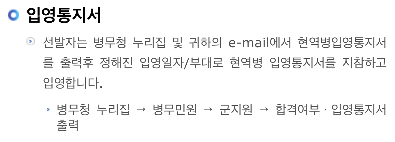 선발자는 병무청 누리집 및 귀하의 e-mail에서 현역병입영통지서를 출력후 정해진 입영일자/부대로 현역병 입영통지서를 지참하고 입영합니다.