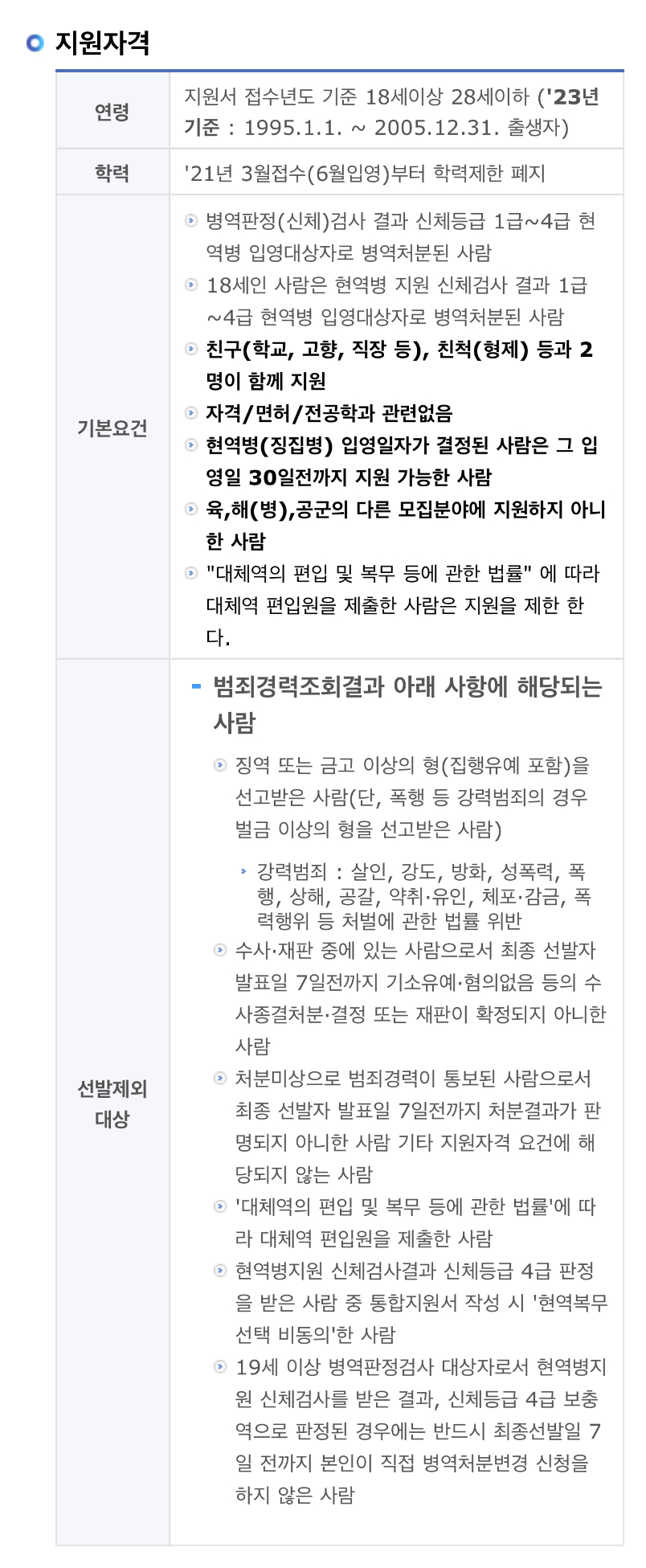 • 반드시 학교 친구나 친척 등 친분관계가 있는 사람끼리만 지원가능, 조기입영을 목적으로 친구관계를 위장하여 지원한 사실이 확인될 경우 선발제외(취소) 조치 등 불이익 처분을 받게 됨