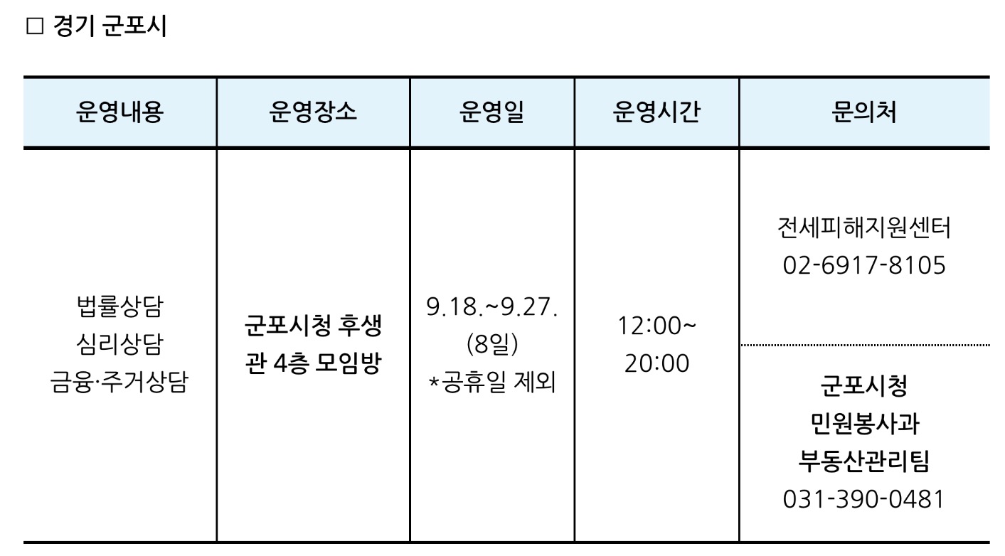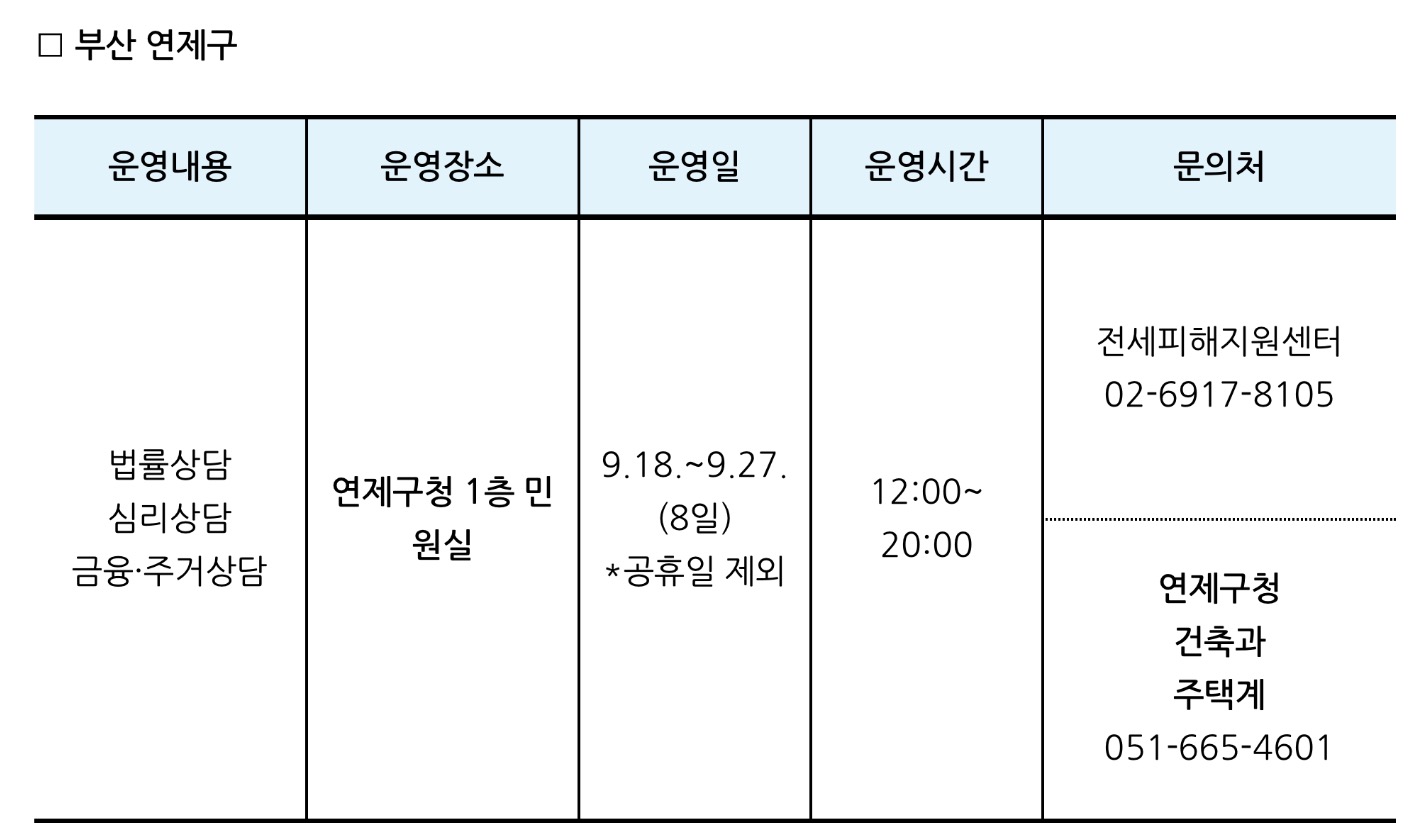 피해 임차인들을 위해 법률 및 심리, 금융·주거 지원 상담 서비스를 낮 12시부터 저녁 8시까지 제공하며, 아울러 거동이 불편하거나 외출이 부담스러운 분들도 서비스를 지원받을 수 있도록 사전예약(유선*)을 통한 자택 방문서비스도 제공한다고 합니다.