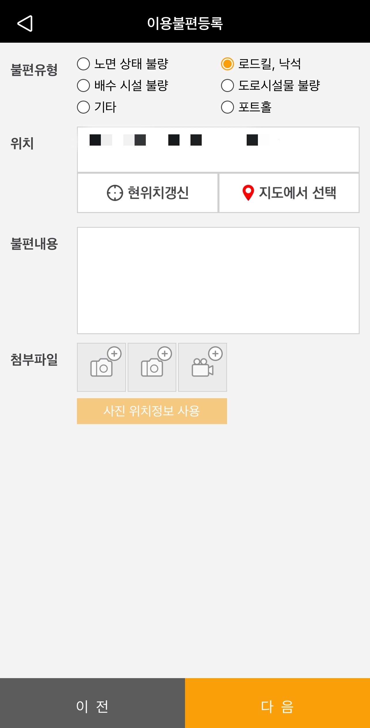 이후 불편 내용을 작성하고 첨부파일에 사진 또는 영상을 첨부하시면 되는데 민원 처리 기관에서 도로 위 문제를 잘 파악할 수 있도록 현장 상황이 잘 담긴 사진을 첨부하는 것이 좋습니다.