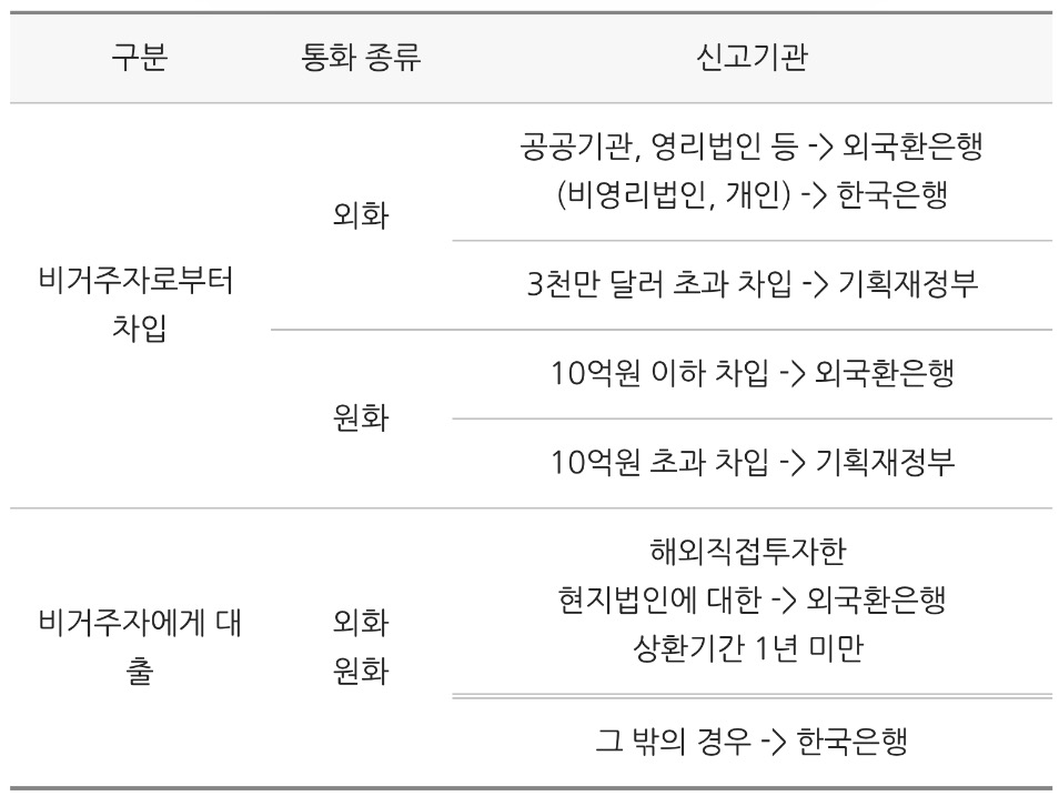 A. 거주자가 비거주자로부터 외화자금을 차입하는 경우 외국환은행장 또는 한국은행충제에게 신고를 하여야 함