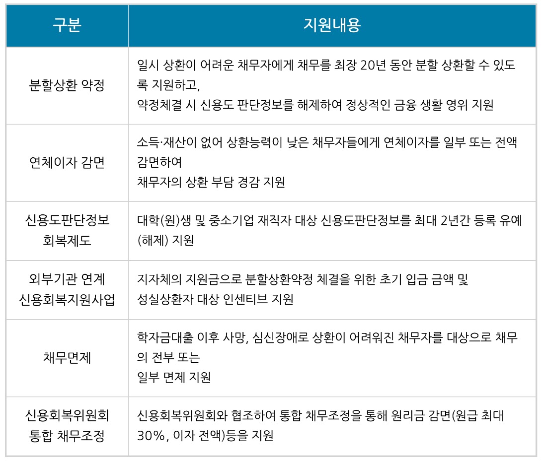 • 연체이자 감면: 소득•재산이 없어 상환능력이 낮은 채무자 들에게 연체이자를 일부 또는 전액 감면하여 채무자의 상환 부담 경감 지원