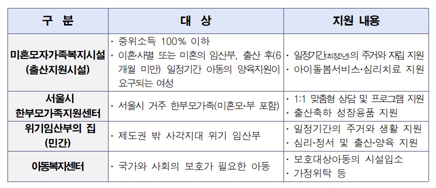 미혼모자가족복지시설은 중위소득 100% 이하의 이혼․사별 또는 미혼의 임산부 및 출산 후(6개월 미만) 일정기간 아동의 양육지원이 요구되는 여성이 입소할 수 있고 서울시한부모가족지원센터는 재가 한부모가족을 대상으로 상담, 출산‧양육 지원 서비스를 제공한다고 합니다