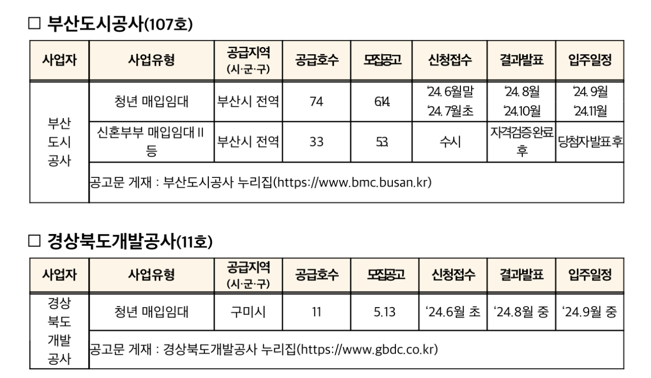 국토교통부(장관 박상우)는 2024년 6월 27일(목)부터 전국 17개 시·도 중 14개 시·도에서 청년과 신혼·신생아 가구를 위한 매입임대주택 입주자를 모집한다고 밝혔습니다.