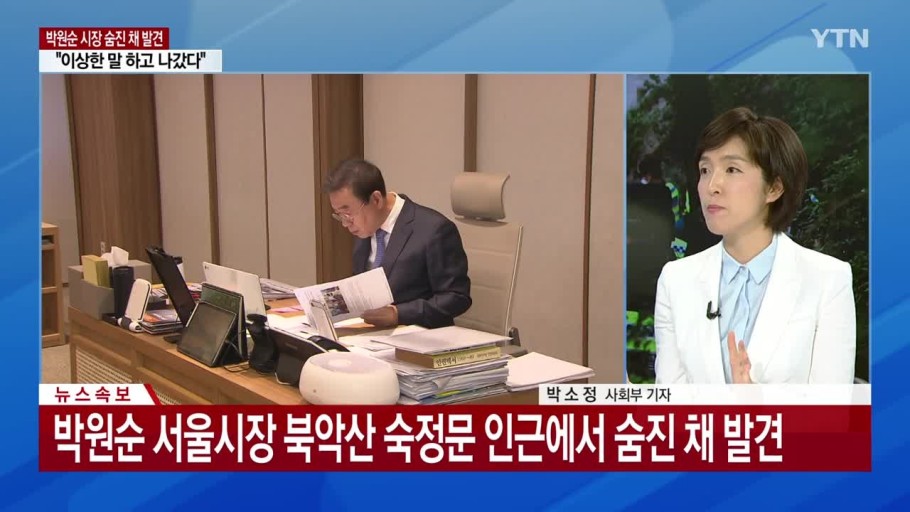 10일 경찰에 따르면 전날 오후부터 박 시장의 모습이 마지막으로 포착된 북악산 일대를 수색하던 경찰은 이날 오전 0시께 숙정문 인근에서 박 시장의 시신을 발견했다.