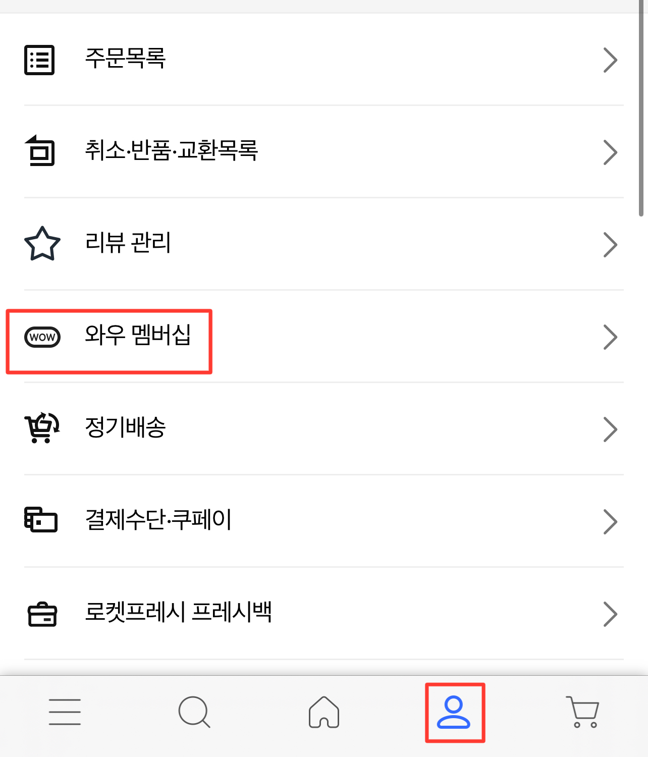 2. 하단에 사람 모양 아이콘 클릭 후 와우멤버십 메뉴 클릭