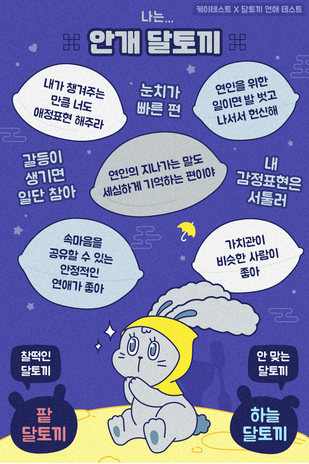 나는 연애할 때 어떤 달토끼를 닮았는지 알아보는 재밌는 테스트가 케이테스트에 새로 나와서 알려드리려고 합니다.
